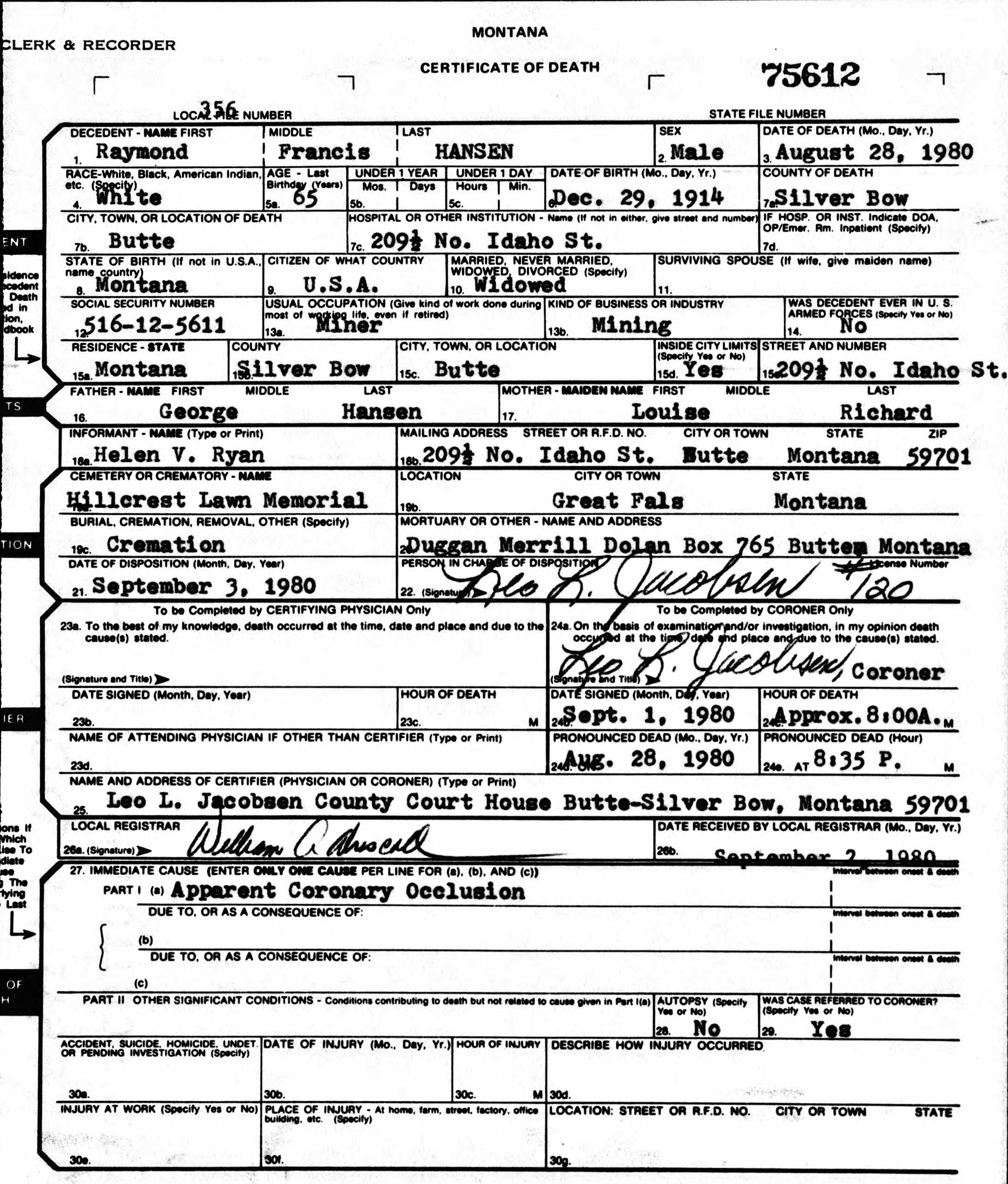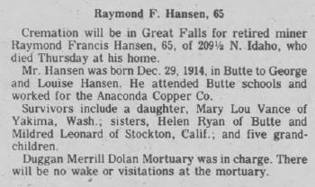 - Raymond Francis Hansen Jr. b. 29 Jul 1940, d. 30 Jun 1941