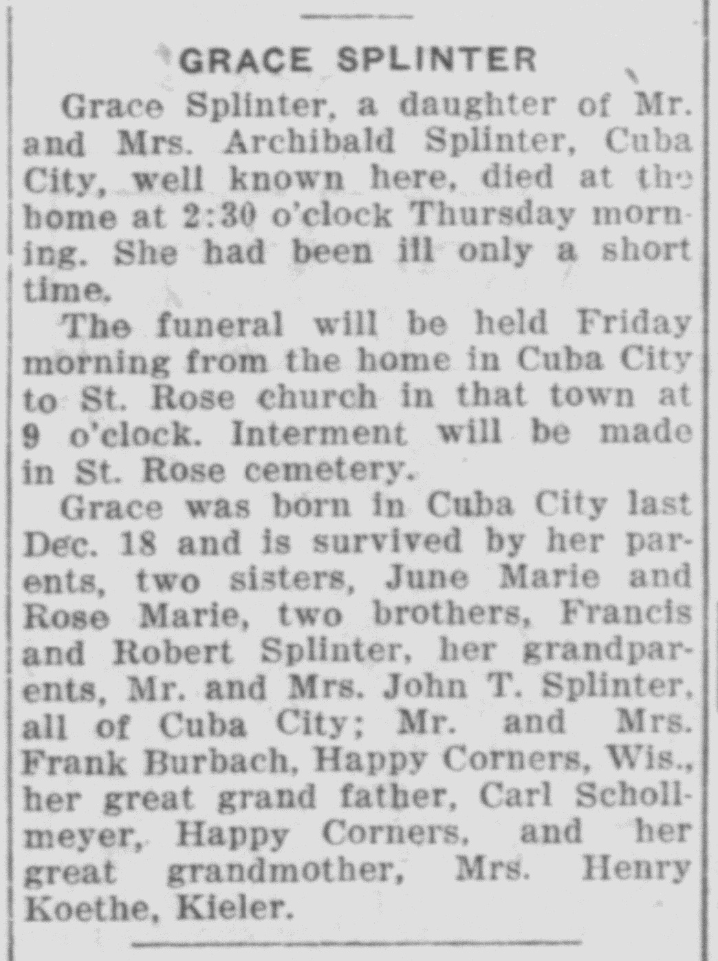 - Grace Splinter b. 18 Dec 1930, d. 5 Feb 1931