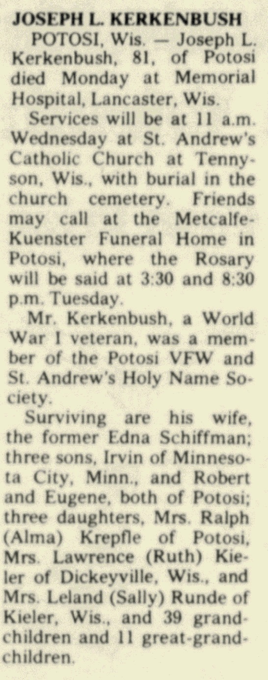 | Father* | Joseph Kerkenbush Sr. d. Mar 1939 |