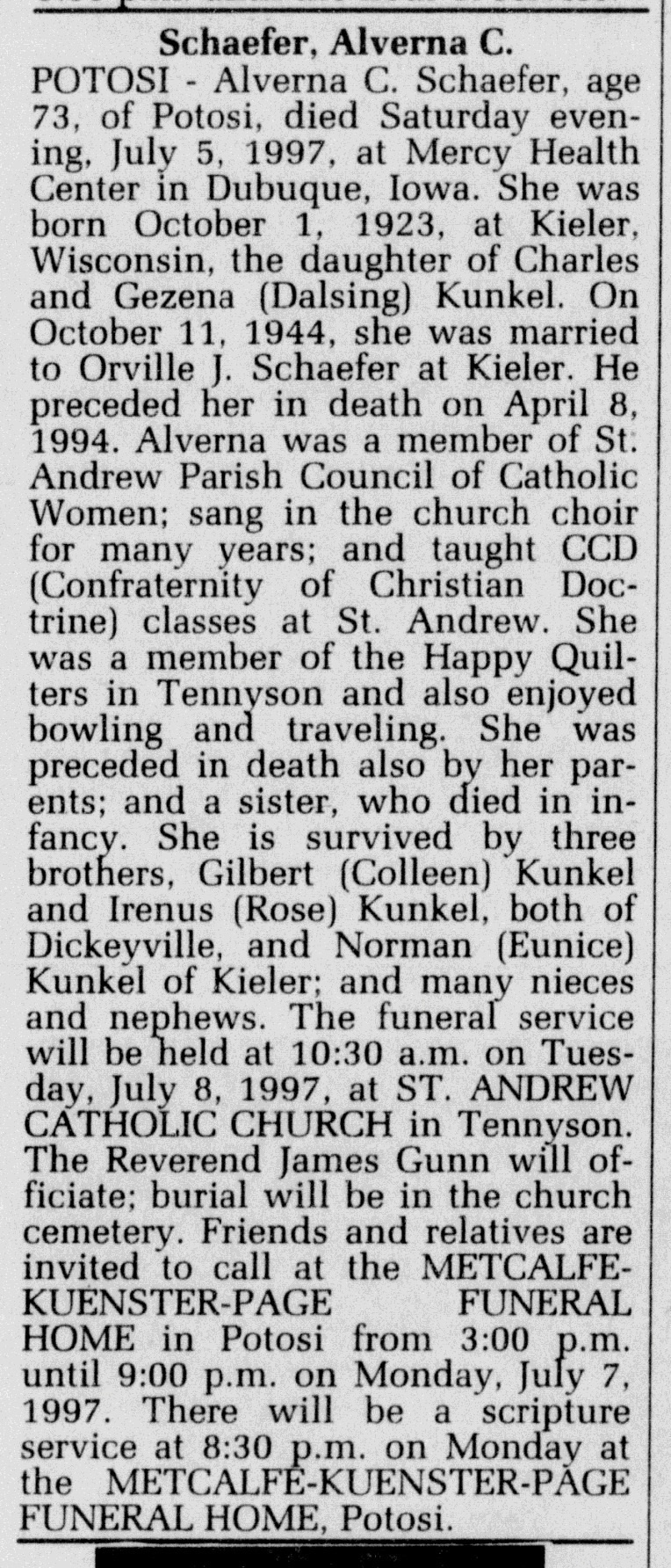 - Alverna C. Kunkel b. 1 Oct 1923, d. 5 Jul 1997