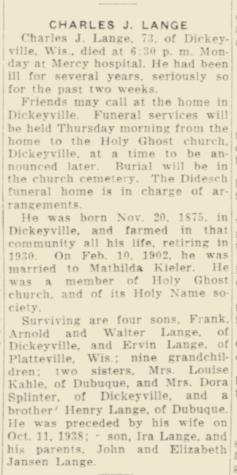 - Ira John Lange b. 17 Feb 1905, d. Mar 1948