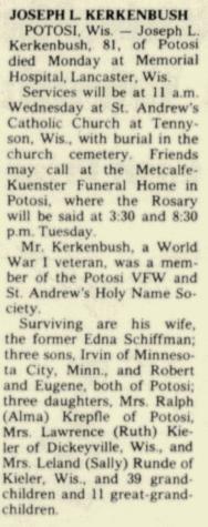 - Irvin Kerkenbush b. 24 Aug 1921, d. 14 Jan 2010