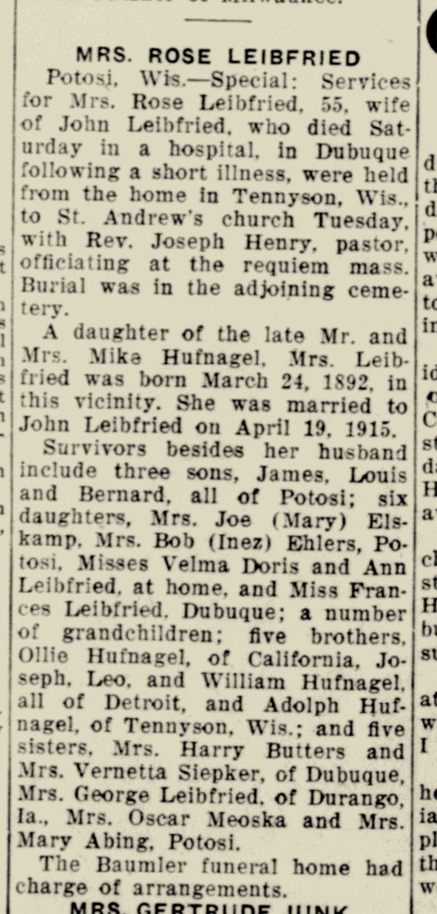 Children of Roselinda Catherine Hufnagel and John Bernard Leibfried