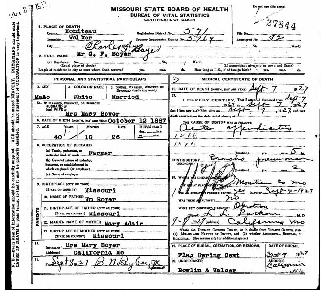 - Samuel Ray Boyer+ b. 16 Aug 1888, d. 23 Oct 1948