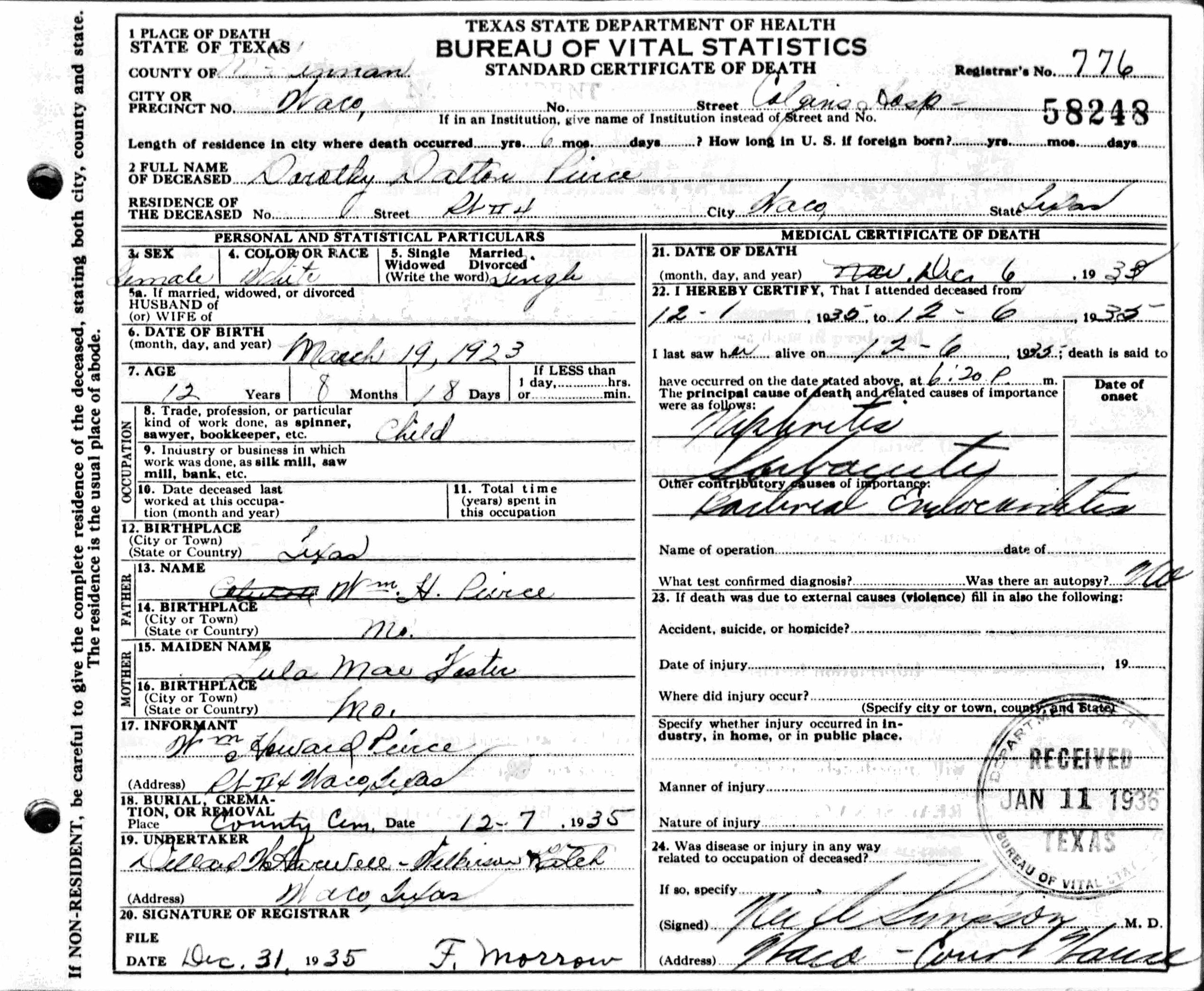 - [S373] U.S. Federal Census 1940 U.S. Federal Census, by Ancestry.com, Year: 1940; Census Place: McLennan, Texas; Roll: T627_4100; Page: 6B; Enumeration District: 155-45.