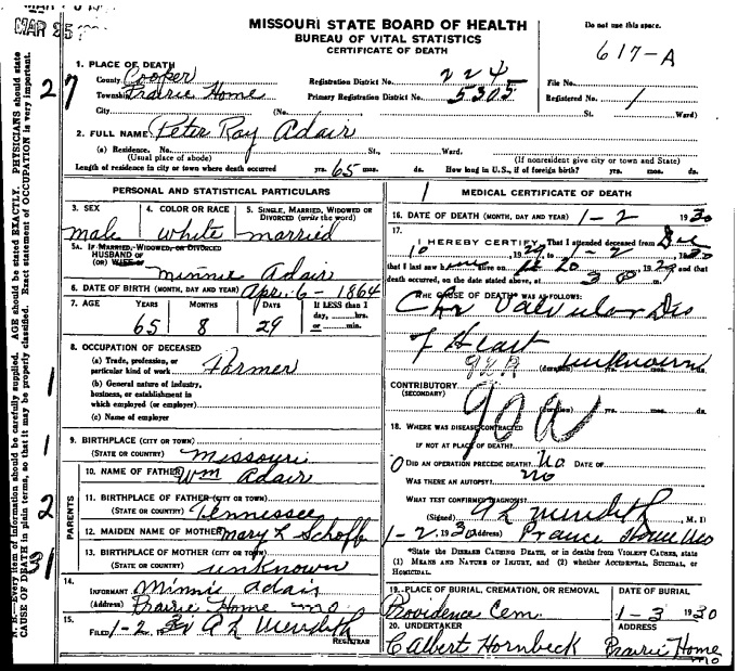 - Peter Ray Adair+ b. 6 Apr 1864, d. 2 Jan 1930