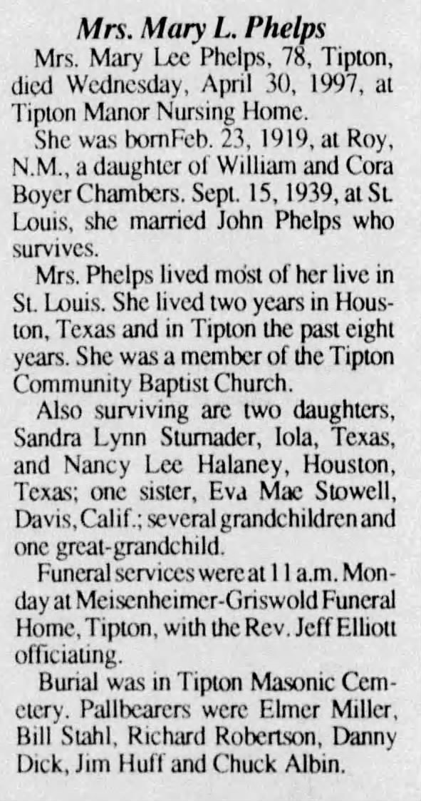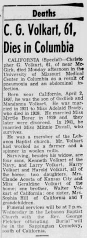 - [S250] U.S. Federal Census 1930 U.S. Federal Census, by Ancestry.com, Year: 1930; Census Place: Prairie Home, Cooper, Missouri; Page: 3B; Enumeration District: 0023.