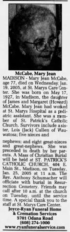 - Mary Jean McCabe b. 17 May 1927, d. 19 Jan 2005