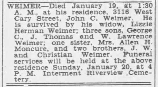 - George Christian Weimer b. 13 Mar 1902, d. 4 Nov 1976