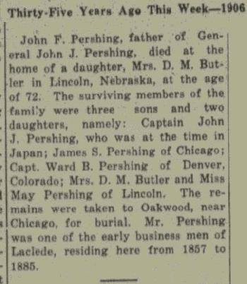 - John Fletcher Pershing+ b. 1 Mar 1834, d. 16 Mar 1906