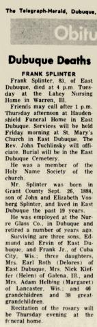 - Frank Splinter Jr. b. 3 May 1906, d. 6 Jul 1980