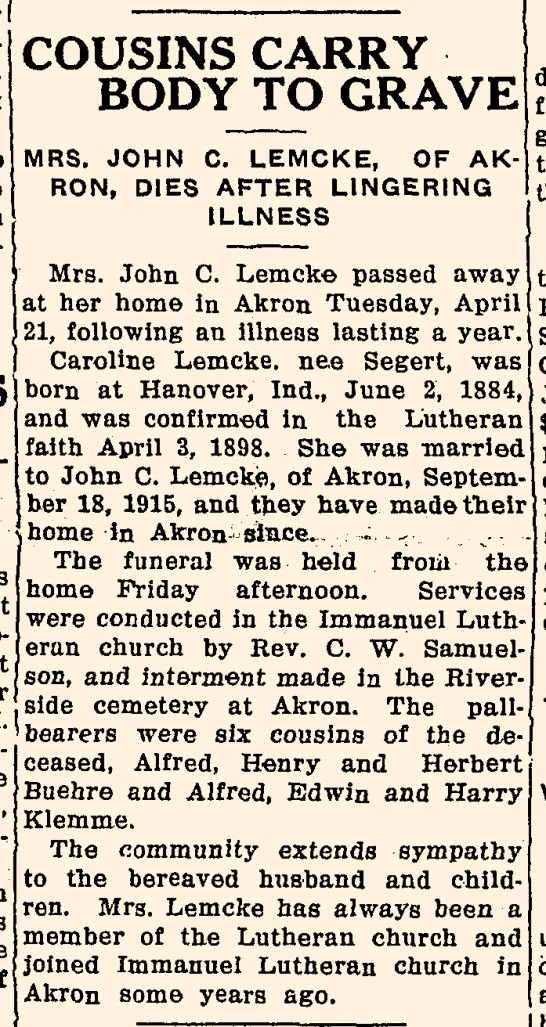 - Caroline Segert b. 2 Jun 1884, d. 21 Apr 1932