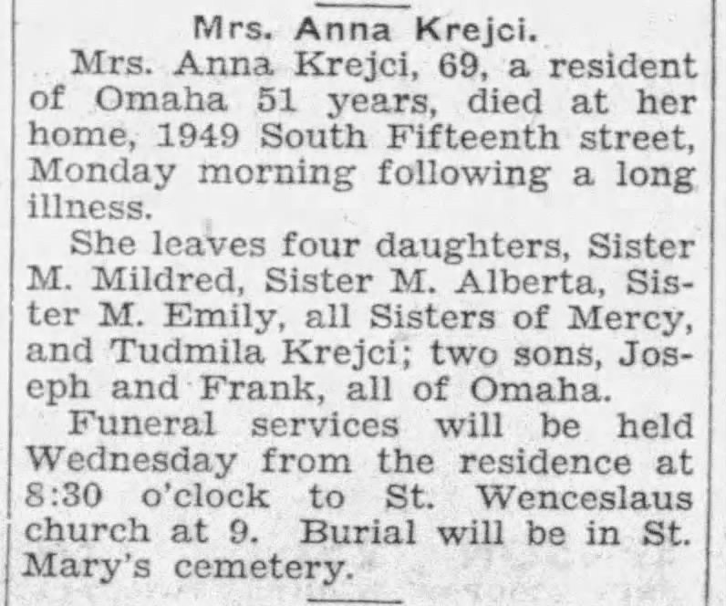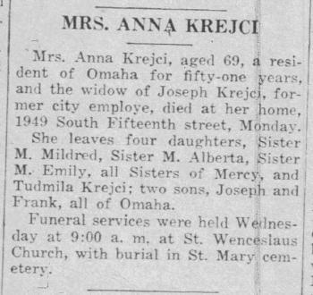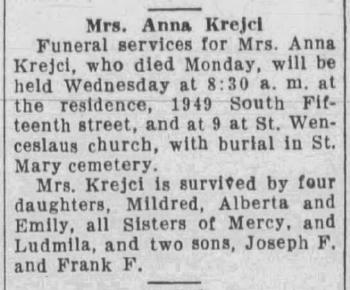 - Anna F. Krejci b. 26 Feb 1901, d. 21 Oct 1978