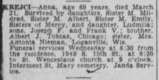 - Antonia A. Krejci b. 7 Aug 1894, d. 3 Feb 1968