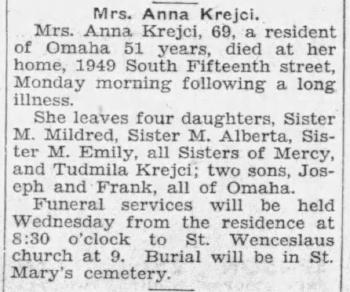 - Marie A. Krejci b. 20 Aug 1886, d. 22 Aug 1928