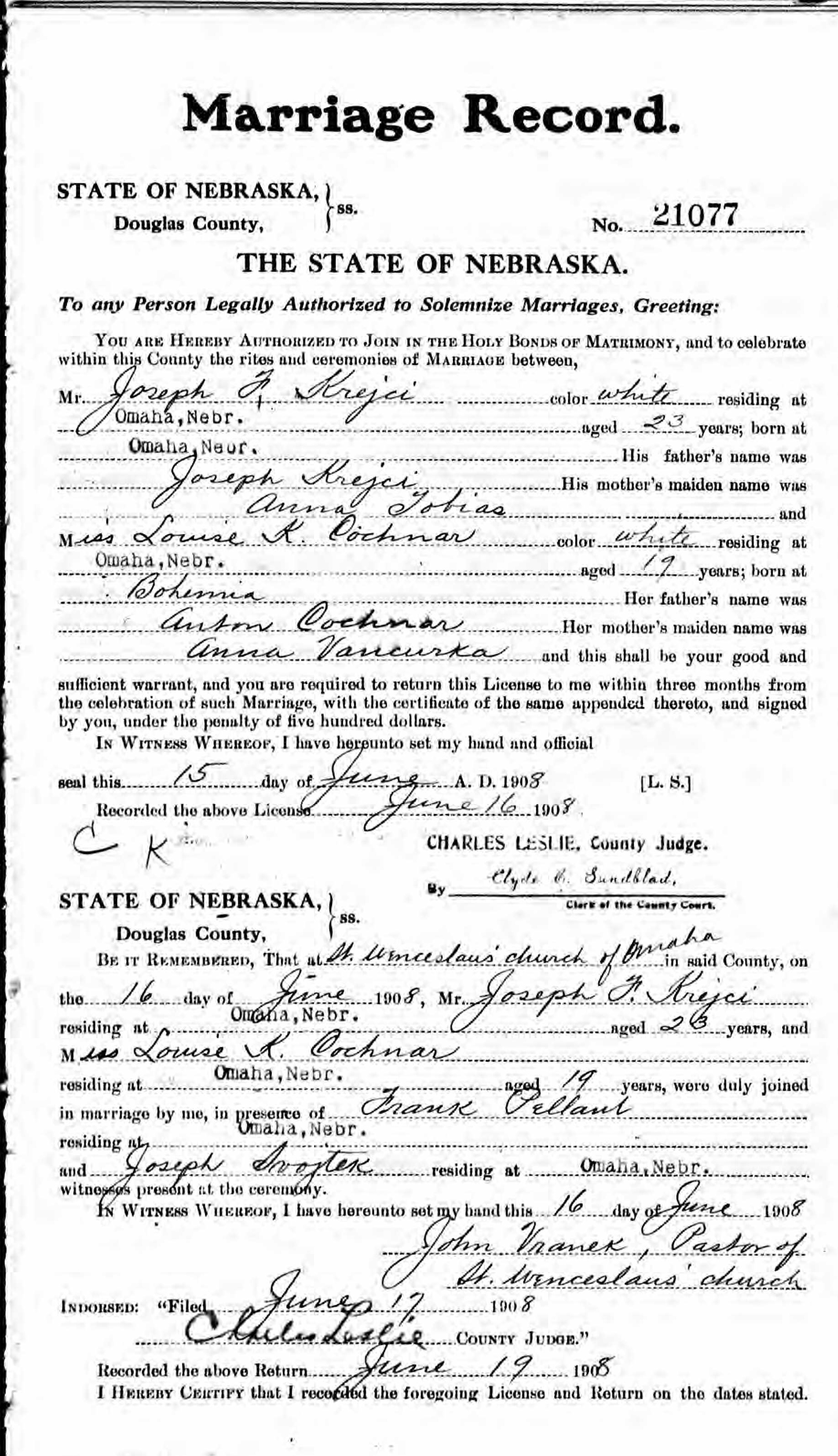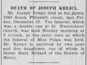 - Joseph P. Krejci+ b. 19 Sep 1859, d. 21 Feb 1937