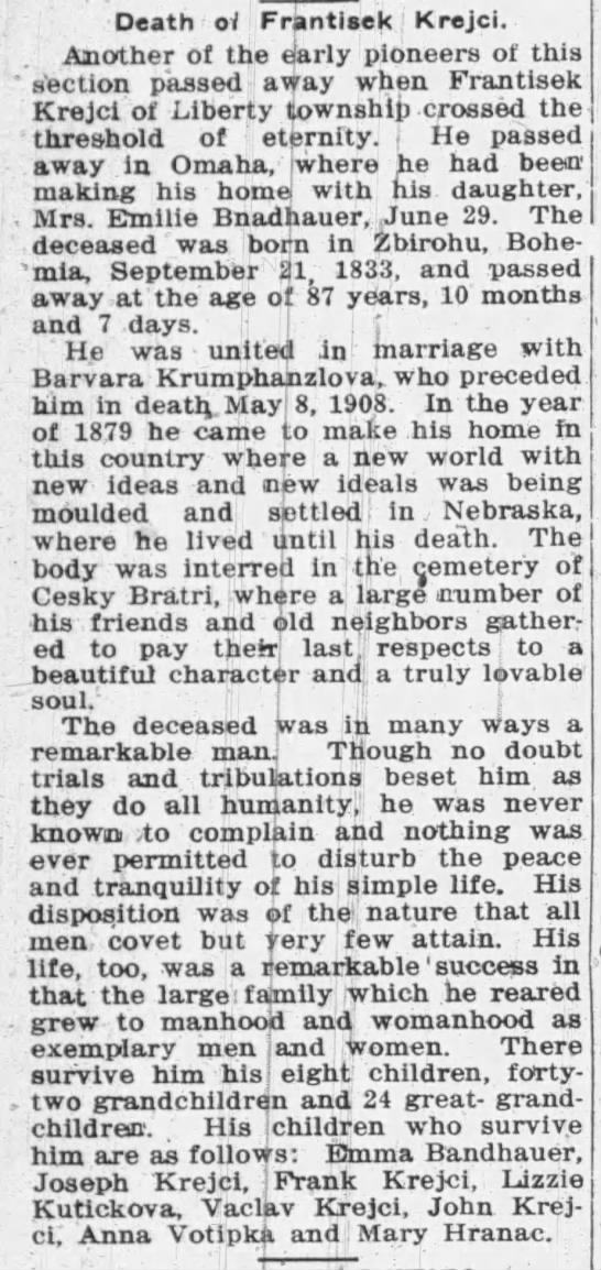 | Father* | Frantisek Krejci Sr. b. 21 Sep 1833, d. 29 Jun 1921 |