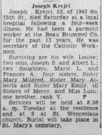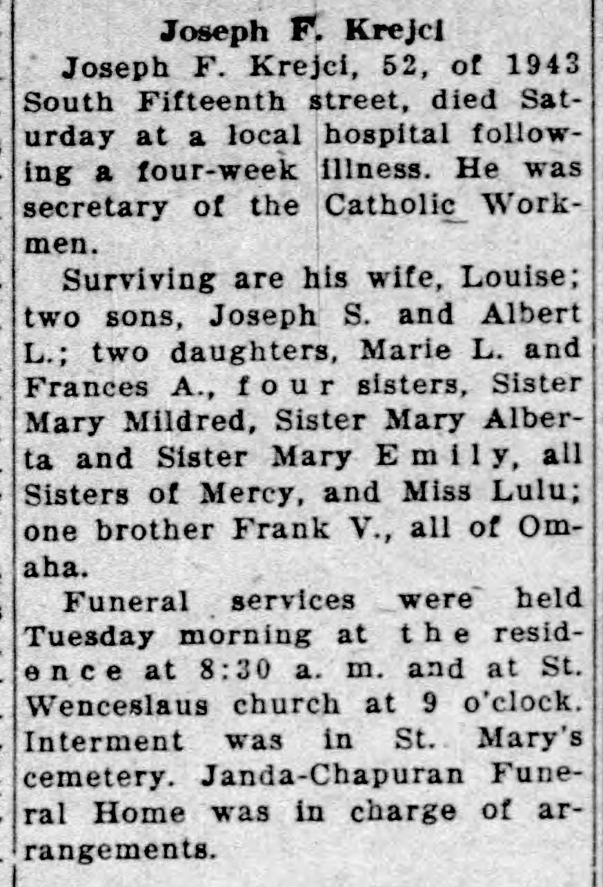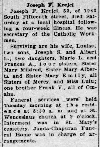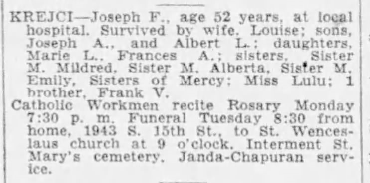 | Father* | Joseph Frank Krejci b. 19 Aug 1884, d. 7 Aug 1937 |