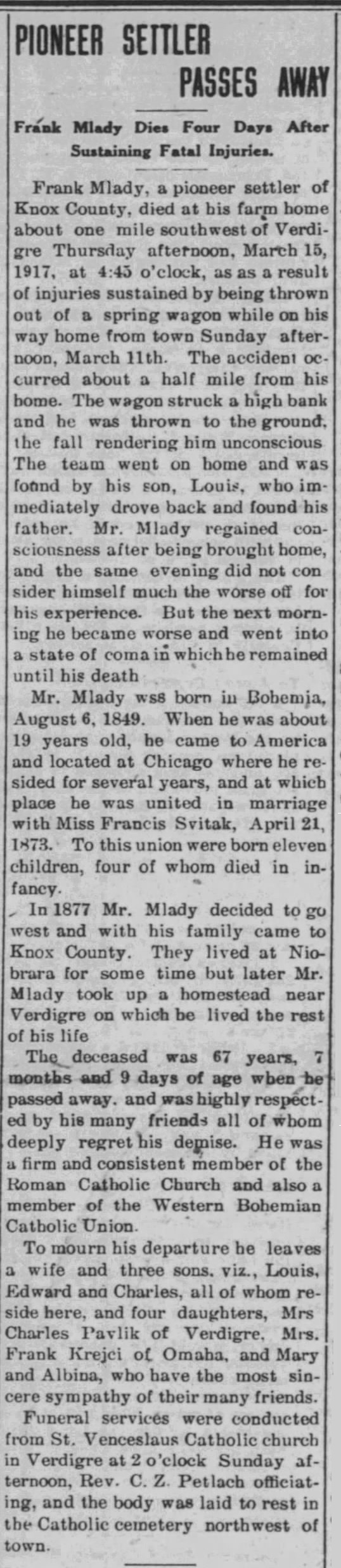 | Father* | Frank Mlady b. 6 Aug 1849, d. 15 Mar 1917 |