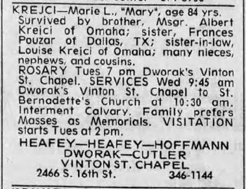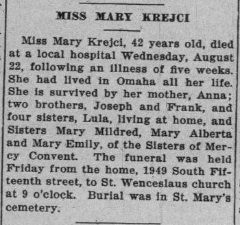 - Marie A. Krejci b. 20 Aug 1886, d. 22 Aug 1928