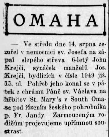 - John Krejci b. 4 Dec 1905, d. 14 Aug 1912