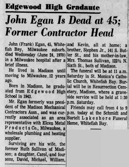- Timothy Charles Egan b. 7 Oct 1952, d. 20 Nov 2017