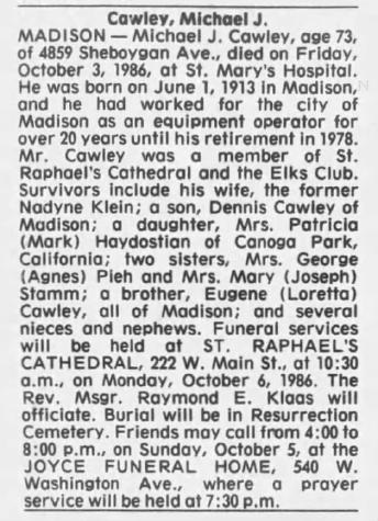 | Father* | Michael J. Cawley b. 1 Apr 1874, d. 30 Oct 1974 |