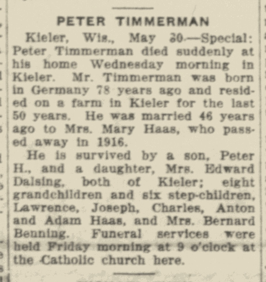 - Peter H. Timmerman+ b. 1887, d. Oct 1974