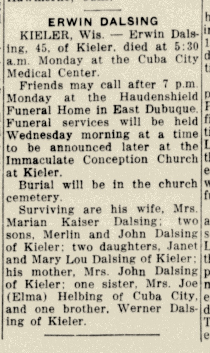 - Erwin Dalsing b. 3 Jan 1921, d. Aug 1965