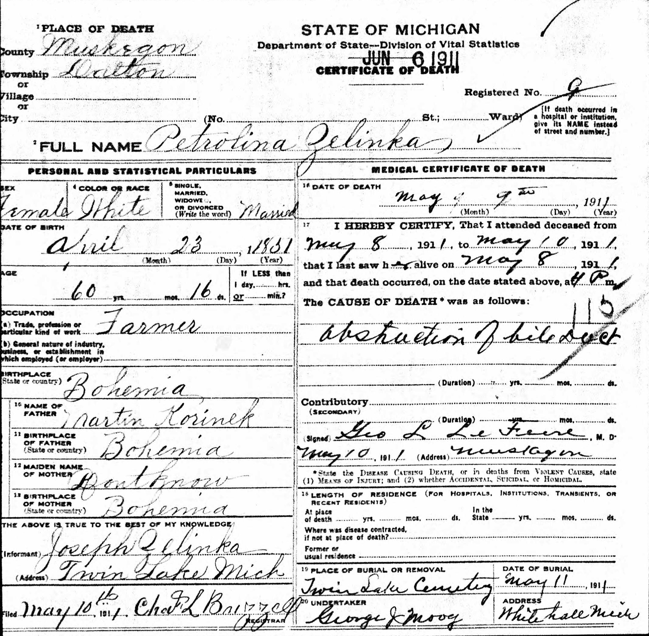 - Petrolina Korinek+ b. 25 Apr 1850, d. 9 May 1911