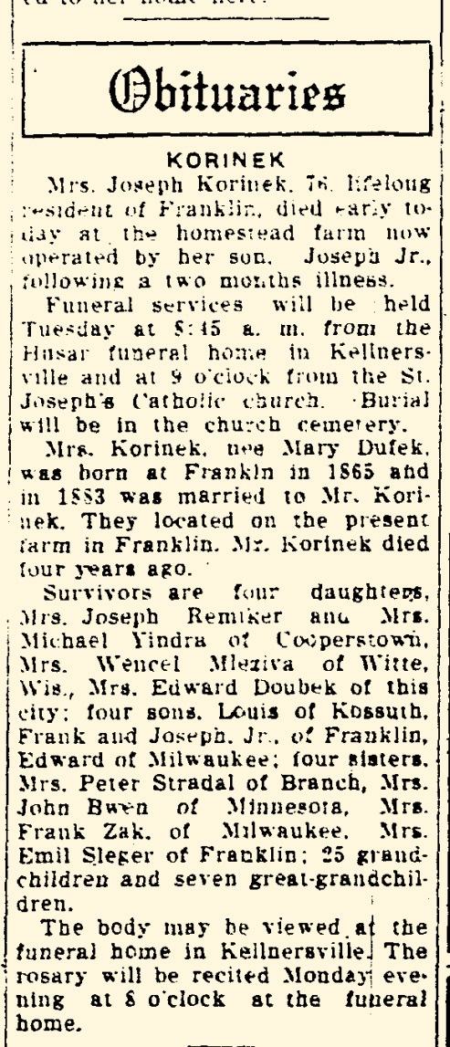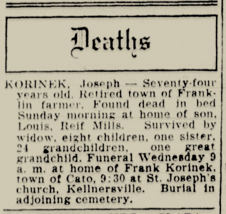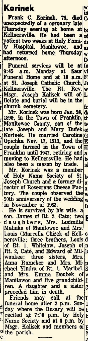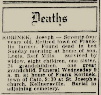 - Frank C. Korinek b. 24 Jan 1890, d. Feb 1965