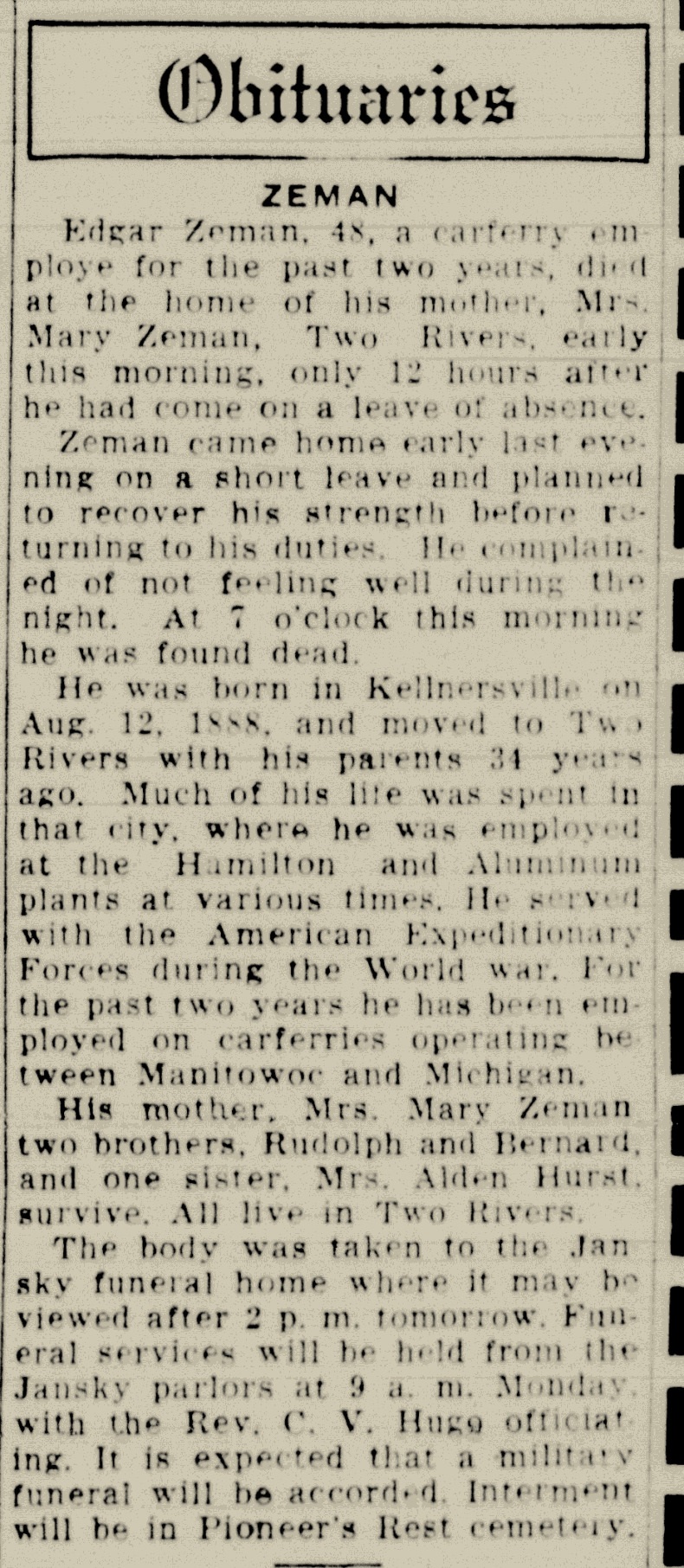 - Miles Zeman b. 16 Aug 1896, d. 8 Jul 1971