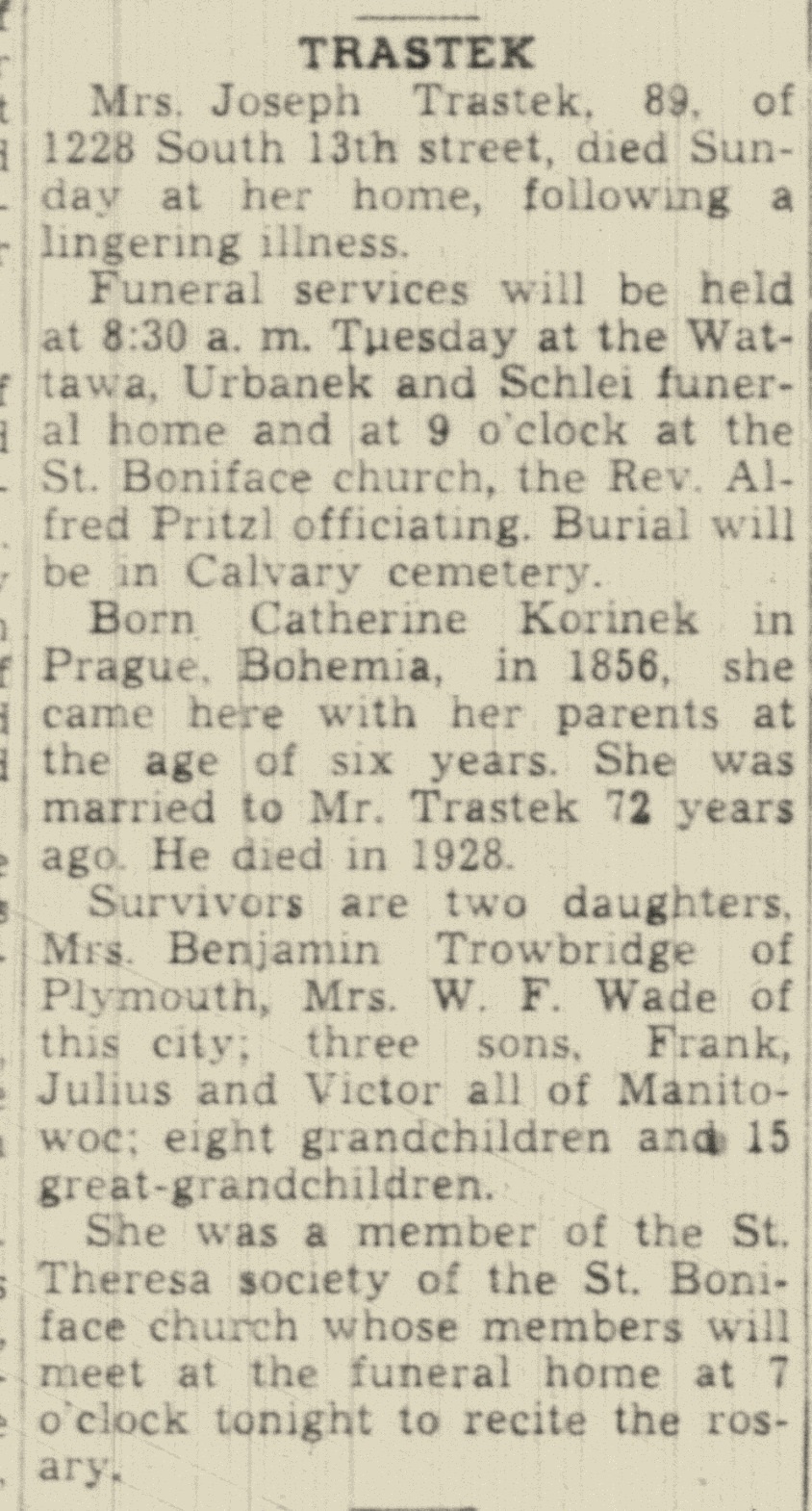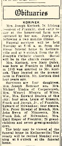 - Katherine Korinek b. Jun 1856, d. 21 Oct 1945