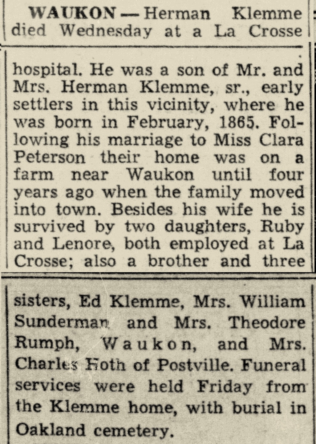 - Otto Conrad Klemme b. 15 Feb 1892, d. 23 Feb 1946