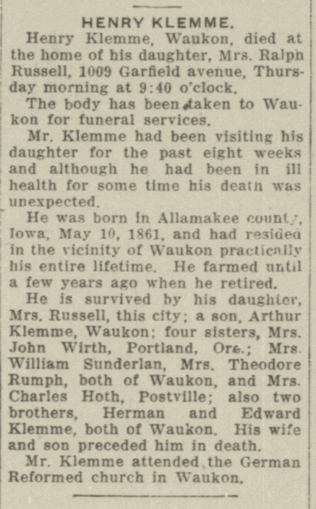 - Henry Klemme b. 10 May 1861, d. Jul 1932