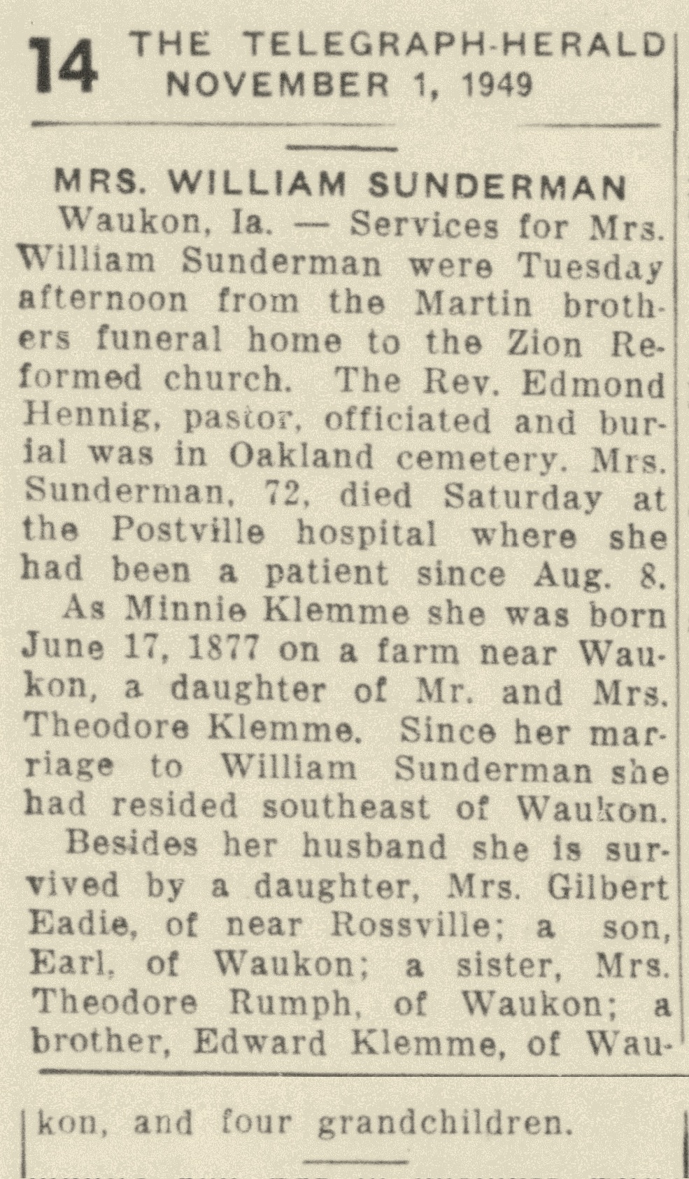 - Minnie Klemme b. 17 Jun 1877, d. 29 Oct 1949