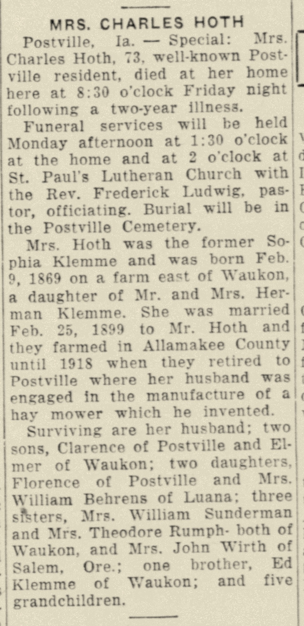 - Sophia Louisa Klemme b. 9 Feb 1869, d. 13 Nov 1942