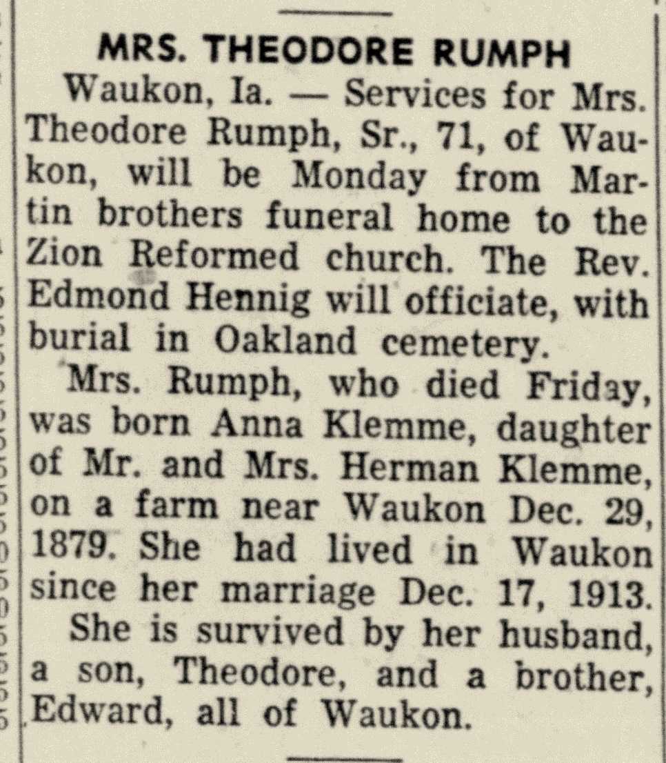 - Anna Marie Klemme b. 29 Dec 1879, d. 31 Aug 1951