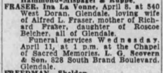 - Ina LaVonne Belcher+ b. 21 Sep 1901, d. 8 Apr 1956