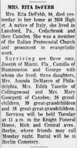 - Assunta DeFebb b. c 1891, d. 17 Nov 1987