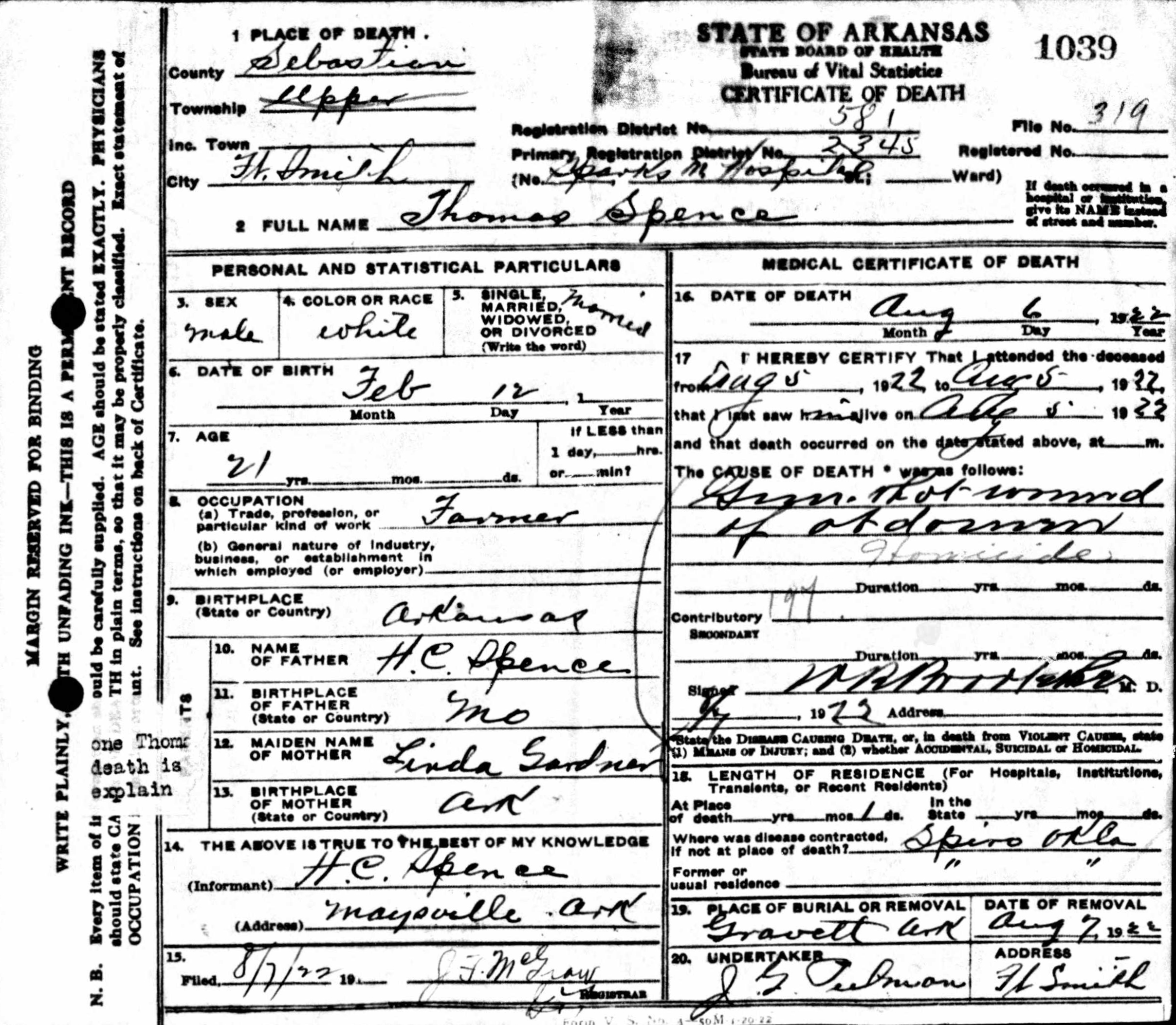 - Thomas Marion Spence b. 12 Feb 1901, d. 6 Aug 1922