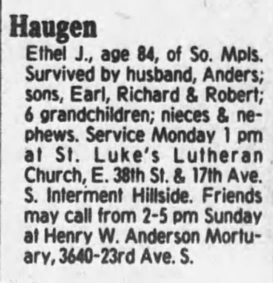 | Mother* | Lena Jeanette Moen b. 2 Feb 1893, d. 1974 |