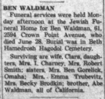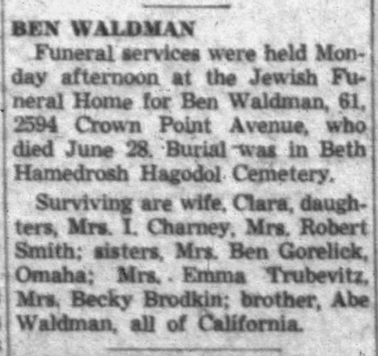 - Ben Waldman b. 28 Mar 1898, d. 28 Jun 1959