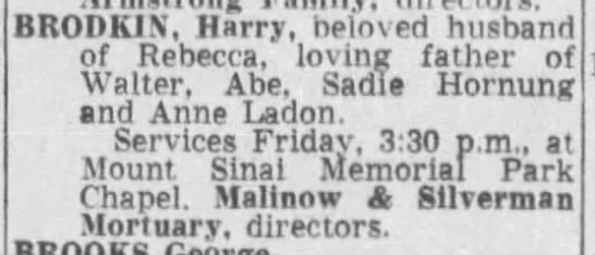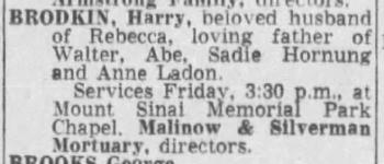 - Harry Brodkin+ b. 15 Aug 1886, d. 14 Jan 1964