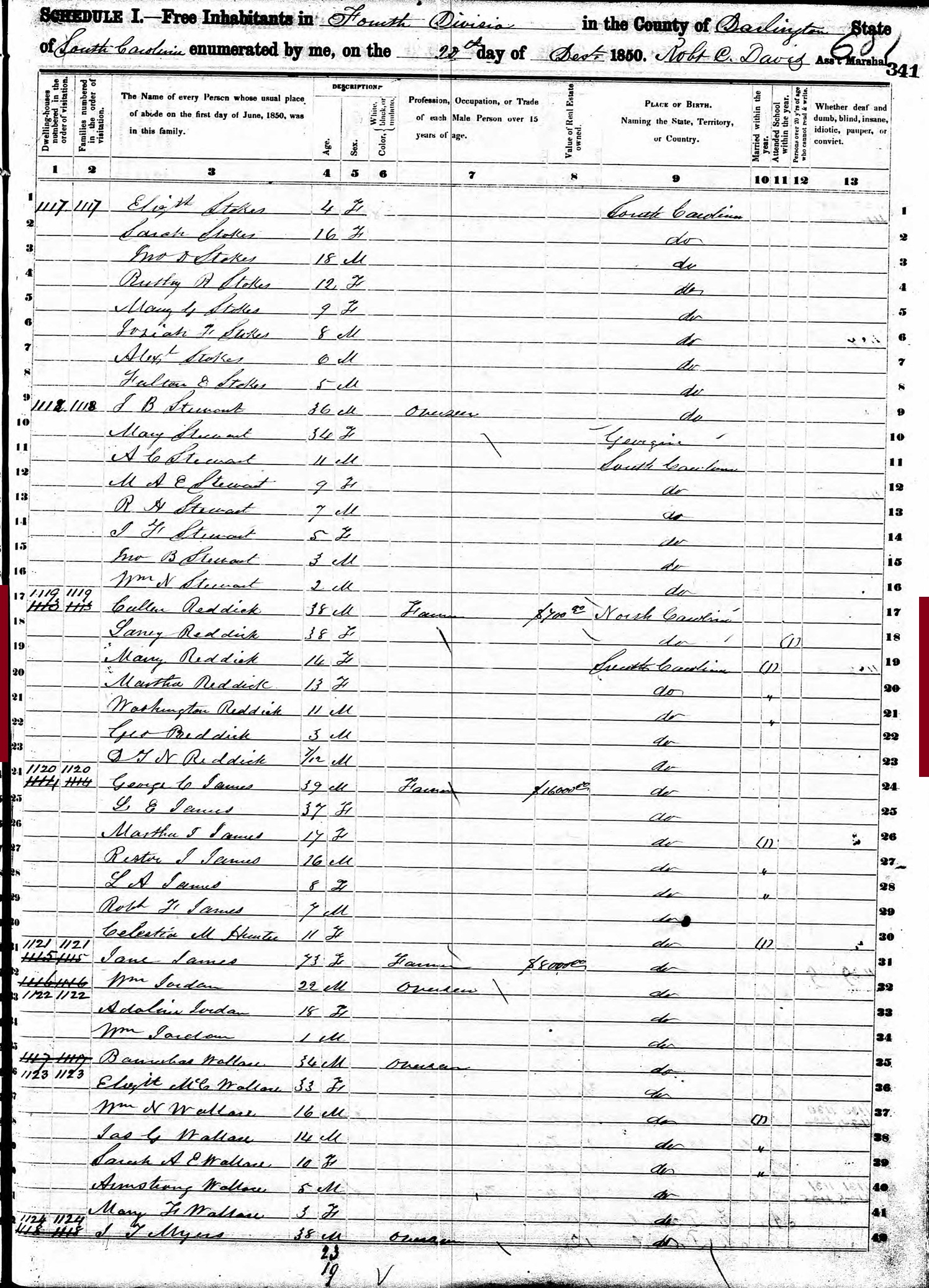 - [S249] U.S. Federal Census 1850 U.S. Federal Census, by Ancestry.com, The National Archives in Washington D.C.; Record Group: Records of the Bureau of the Census; Record Group Number: 29; Series Number: M432; Residence Date: 1850; Home in 1850: Division 4, Darlington, South Carolina; Roll: 851; Page: 341a.