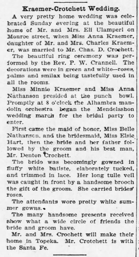 - Anna Kraemer Crotchett b. 23 Feb 1903, d. 18 Jan 1989