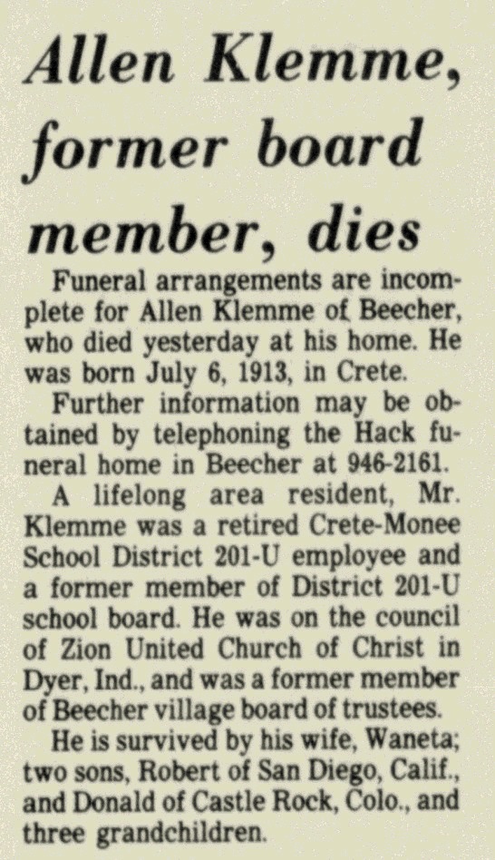 - Frederick H. Klemme b. 4 Aug 1906, d. 6 Sep 1993
