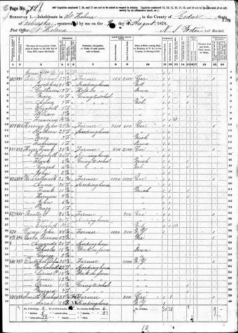 - [S247] U.S. Federal Census 1870 U.S. Federal Census, by Ancestry.com, Year: 1870; Census Place: Saint Helena, Cedar, Nebraska; Roll: M593_828; Page: 178A; Family History Library Film: 552327.