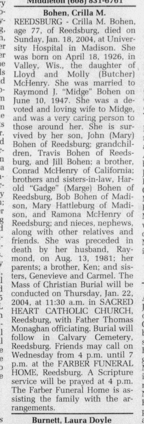 Child of Raymond J. Bohen and Crilla M. McHenry