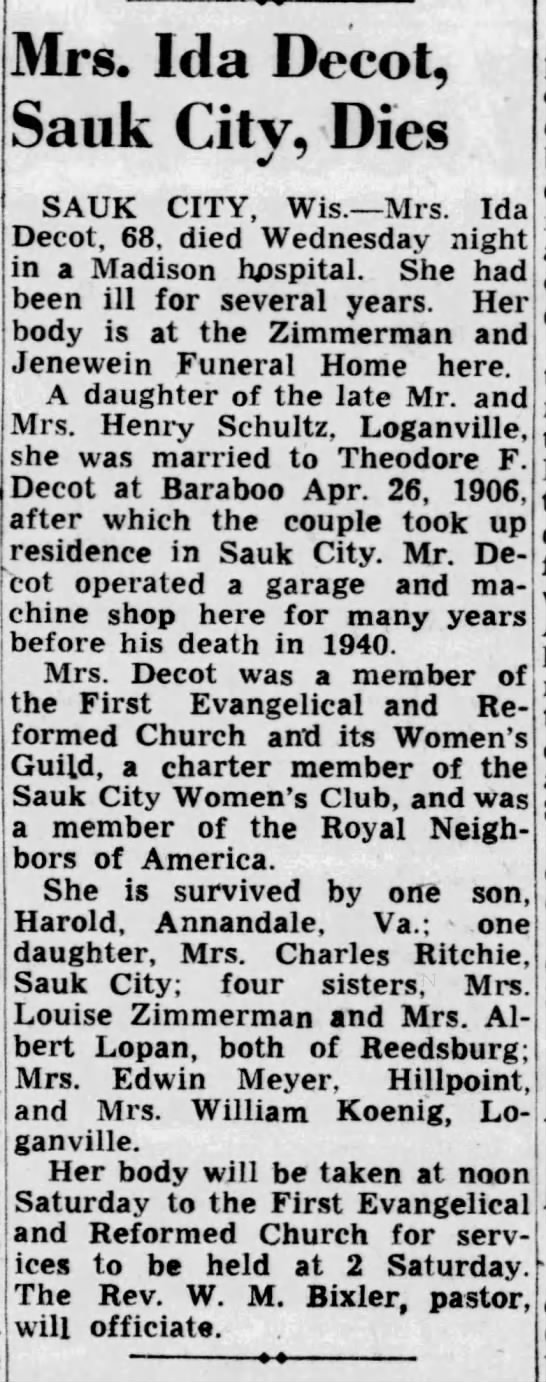 | Father* | Theodore Francis Decot b. 4 Jan 1878, d. 1940 |
